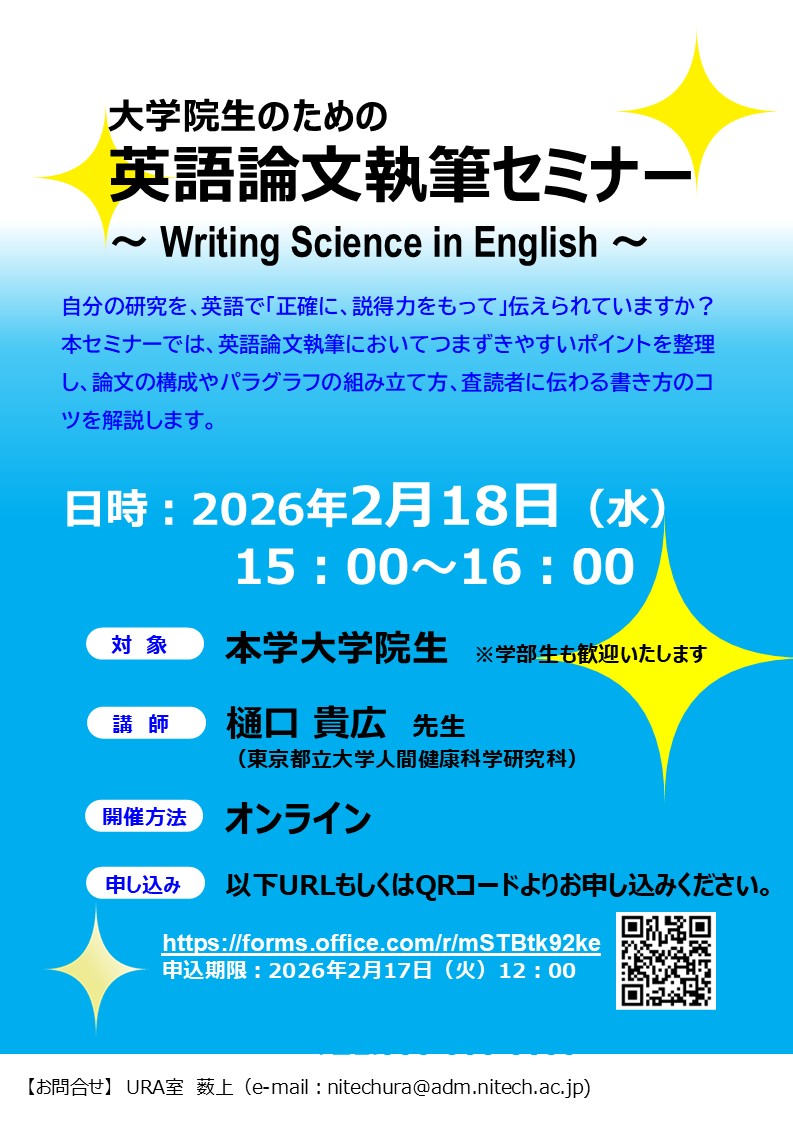 ホーム > 大学院生のための「英語論文執筆セミナー ~Writing Science in English~」を開催します > ポスター(論文執筆セミナー)_rev